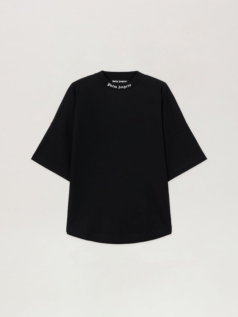 Un capo audace. Questa t-shirt nera oversize presenta il logo gotico di Palm Angels stampato sul colletto, una silhouette pulita che comunica con forza attraverso toni minimalisti